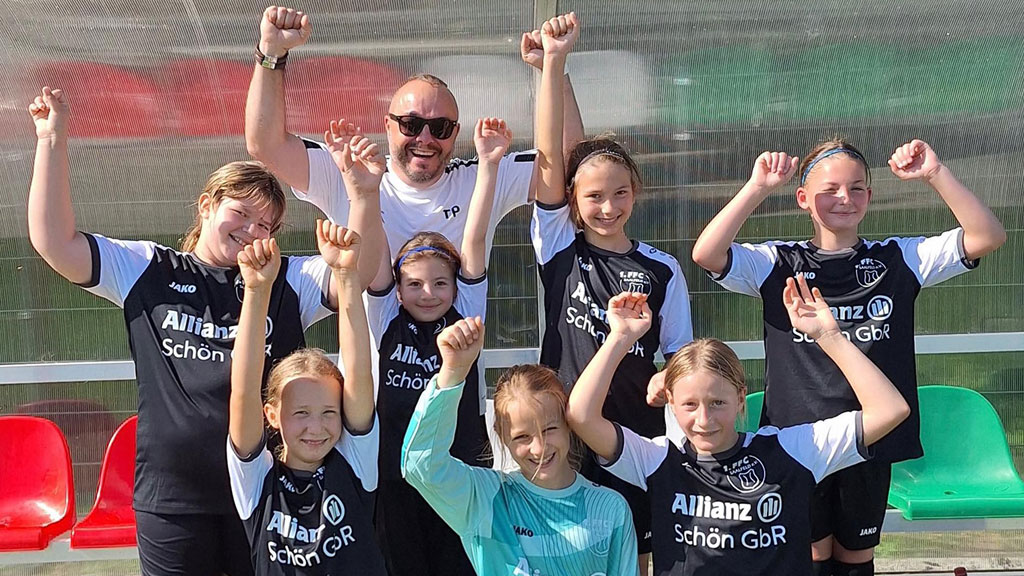 (04.09.25 09:59 Uhr) Dank einer spontanen Begegnung mit dem Torwarttrainer Udo engagierten sich Doreen und Michael Schön von der Allianz-Agentur Schön als Trikotsponsoren für die E-Juniorinnen des 1. FFC Saalfeld. Die Nachwuchskickerinnen bedanken sich mit leuchtenden Augen und ihrem Team-Schlachtruf – und freuen sich auf ein Wiedersehen mit den Sponsoren als Ehrengäste beim Heimturnier.