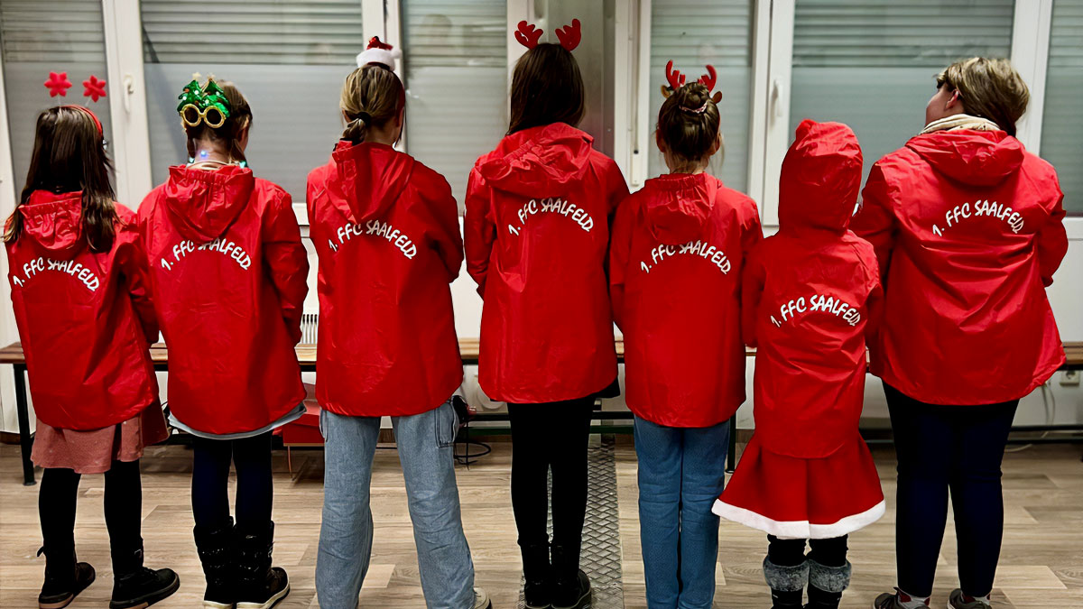 Auch abseits des Spielfelds gab es in dieser Saison besondere Momente. Im Rahmen unserer Weihnachtsfeier erlebten unsere E‑Juniorinnen gleich zwei Highlights. Dank der WWK Agentur Barth erhielt jede Spielerin eine neue Regenjacke. Die Mädchen vom Loksportplatz strahlen nun nicht nur auf dem Rasen, sondern auch im Training bei jedem Wetter.
